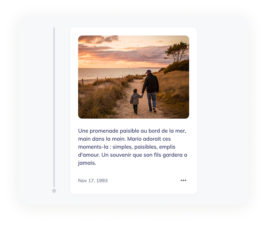 Souvenirs organisés par date, avec images, mots et — si disponible — un lieu. Chaque détail raconte une vie.
