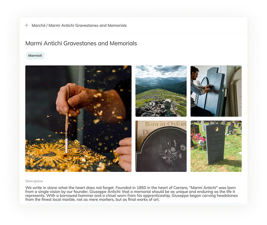 Découvrez des services et des prestataires qui vous aident à commémorer vos proches de manière authentique et significative. Parcourez les offres, consultez les informations de contact et envoyez une demande pour entrer en contact avec un prestataire. Vous proposez un service ? Rejoignez la plateforme en tant que fournisseur et partagez votre soutien avec ceux qui en ont besoin.