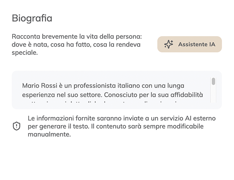 Scrivi un necrologio che onori ciò che la persona ha rappresentato. Può essere anche ascoltato grazie alla versione audio generata con l'AI.